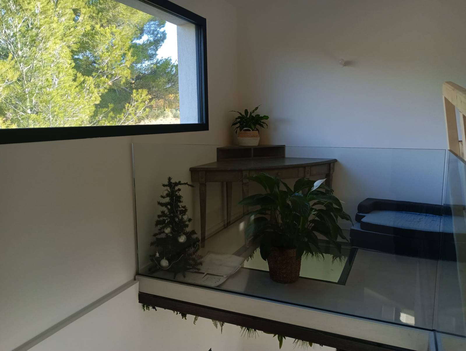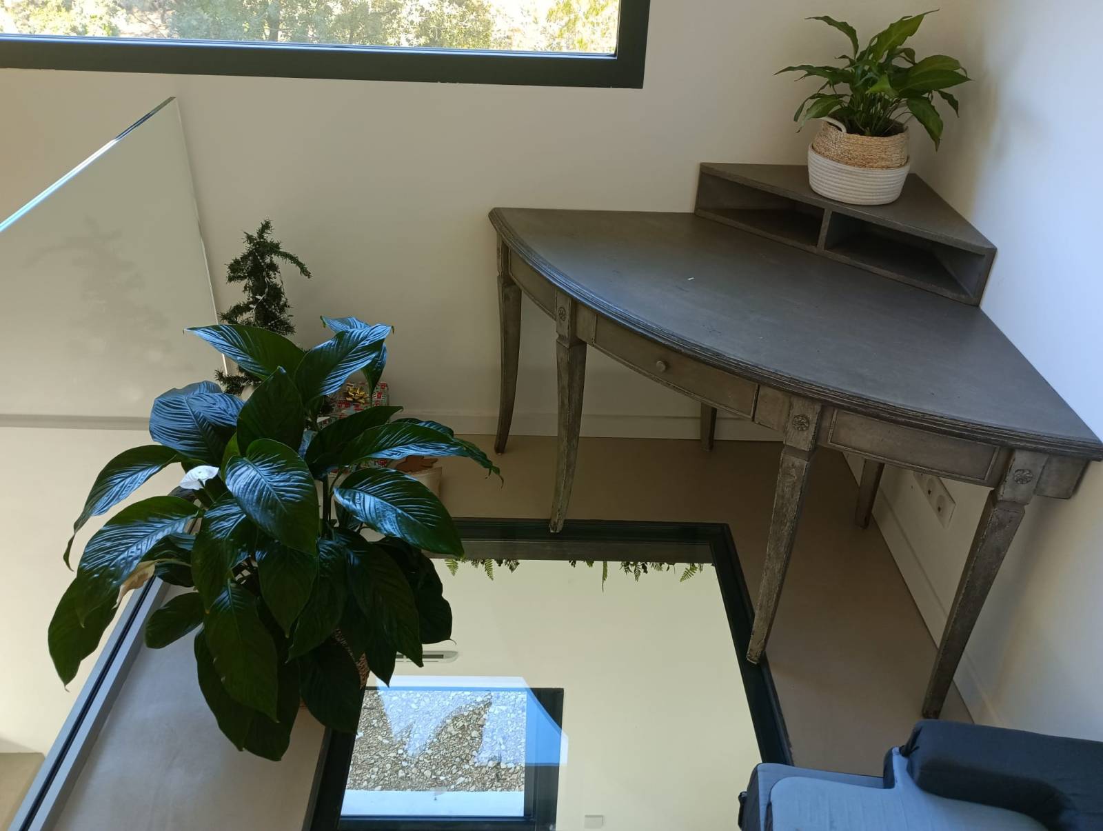 L’encadrement discret et les finitions soignées permettent au puits de lumière de s’intégrer naturellement dans l’espace, en harmonie avec les matériaux existants. Une décoration confortable et végétale vient compléter l’ensemble, mettant encore davantage en valeur la lumière traversante.