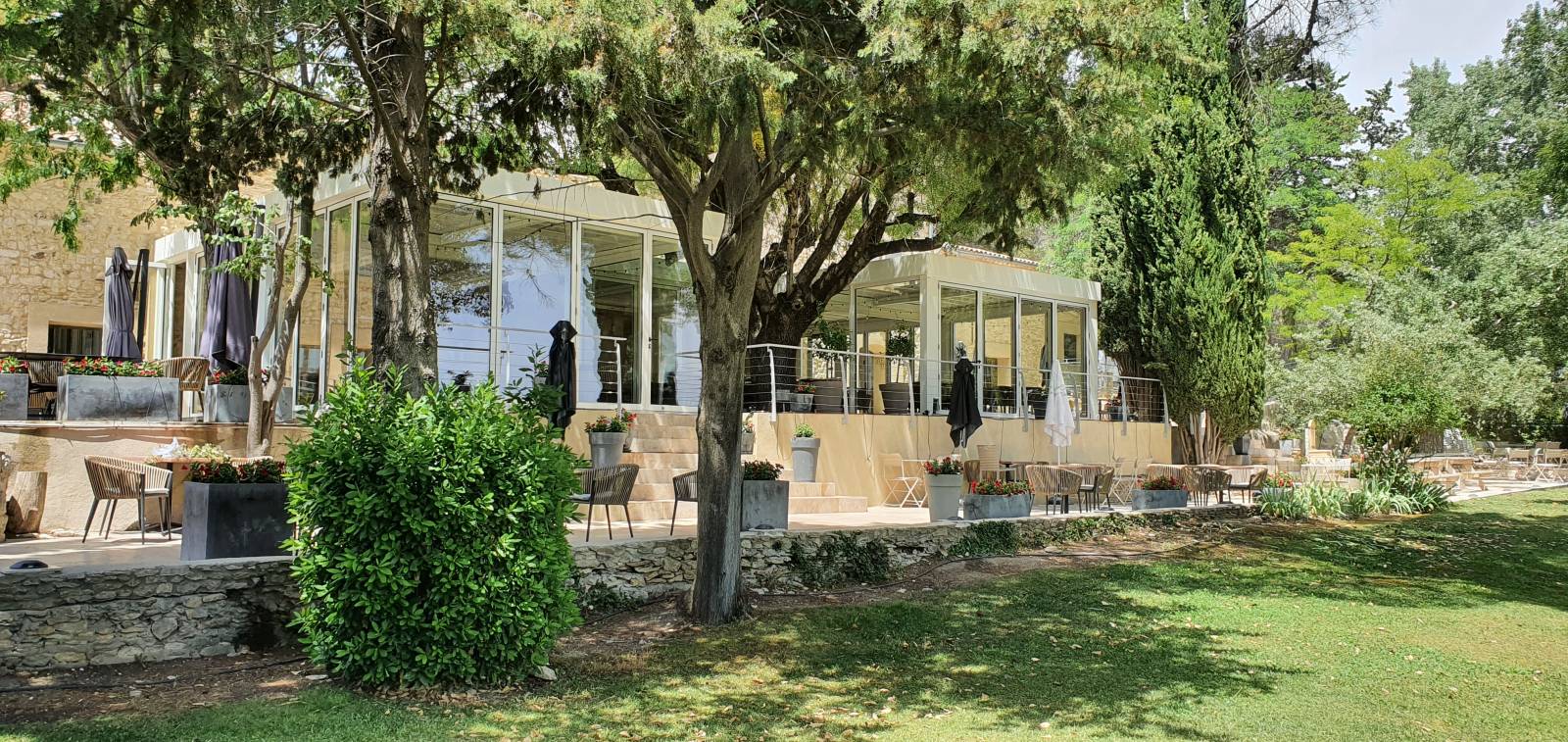 La Bastide de Venelles est un lieu de charme, mêlant pierre apparente, végétation et ambiance chaleureuse. L’enjeu était donc d’installer une structure moderne sans dénaturer l’architecture du site. Les profils fins de la pergola et des baies accordéon, la couleur choisie et le travail sur les proportions permettent une intégration harmonieuse avec les façades et la terrasse existante.
