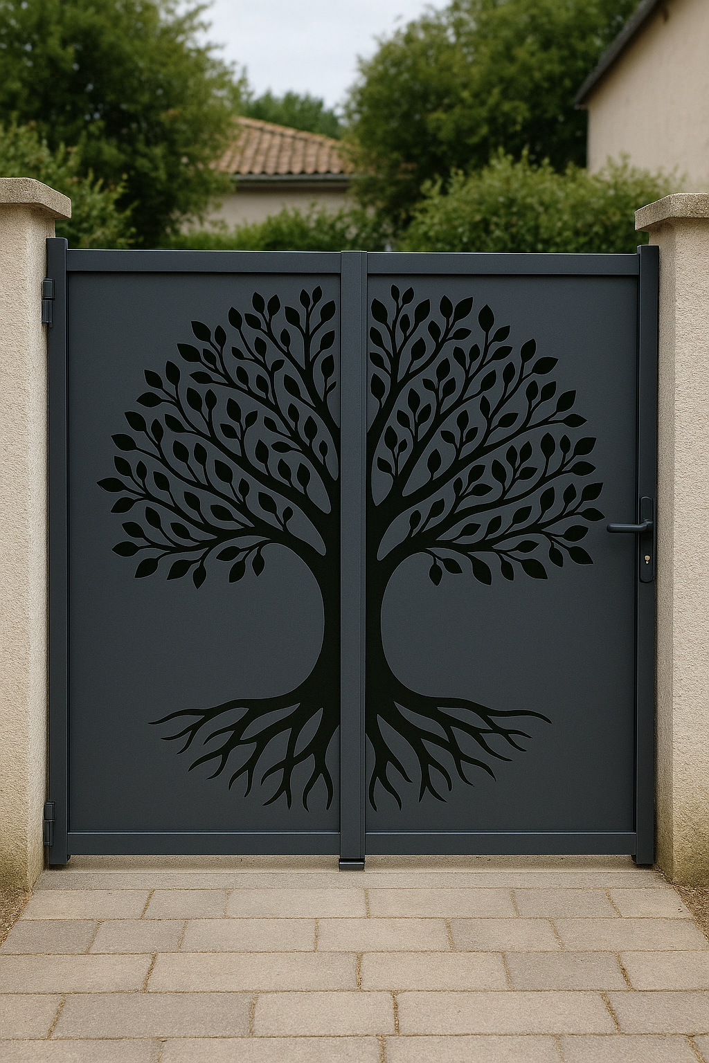 Chez Green House Menuiseries, nous croyons que votre portail n’est pas qu’un simple élément de clôture : c’est aussi la première impression de votre maison. Avec nos portails sur mesure en découpe laser, nous vous proposons des créations uniques, comme le motif arbre de vie, qui associe élégance, solidité et une véritable touche artistique.