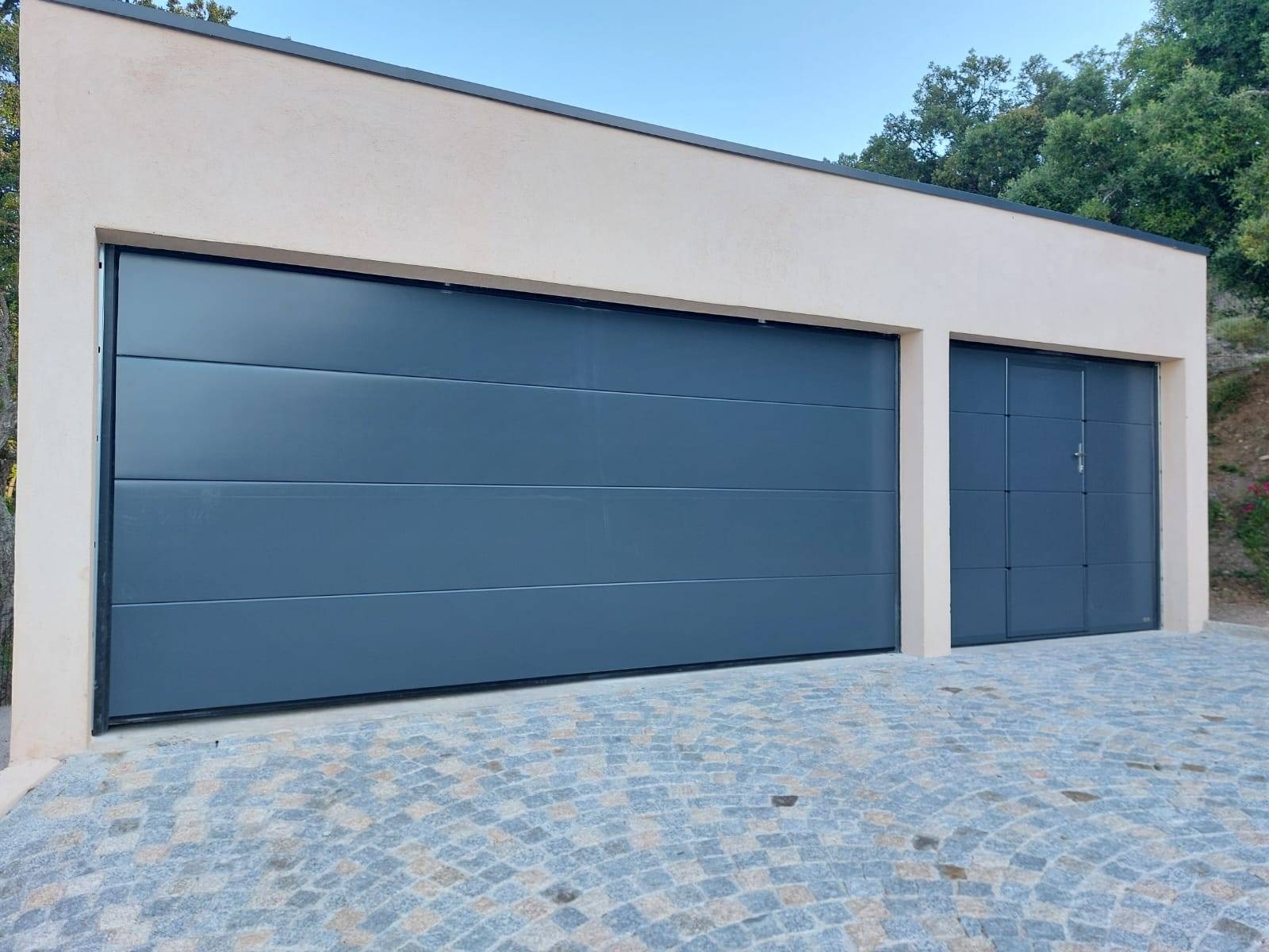 Le modèle installé présente un fini lisse gris anthracite, idéal pour sublimer des constructions modernes. Grâce à ses panneaux isolés et à son ouverture verticale silencieuse, la porte sectionnelle s’adapte parfaitement aux garages spacieux typiques des villas d’architecte du secteur aixois.