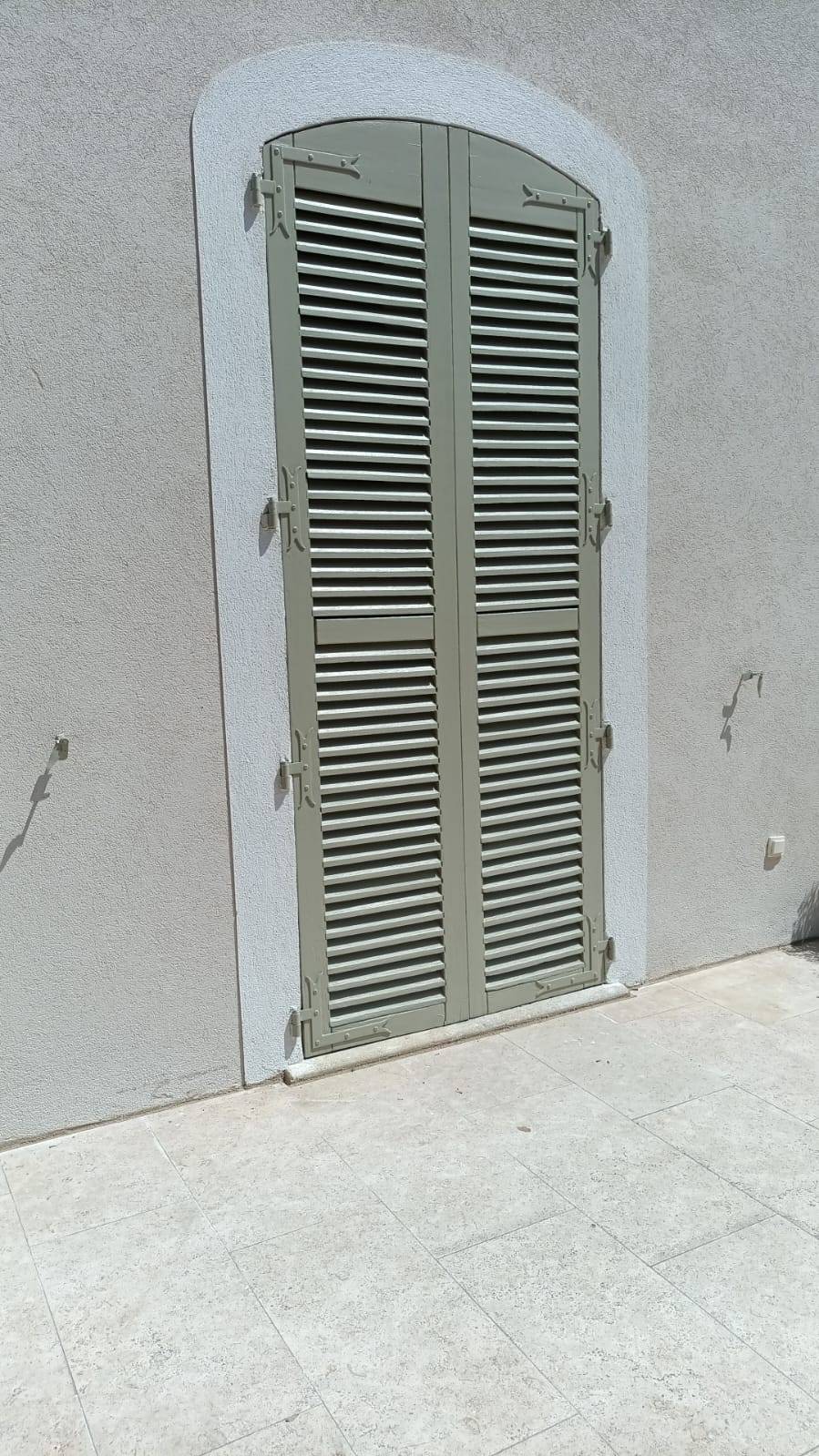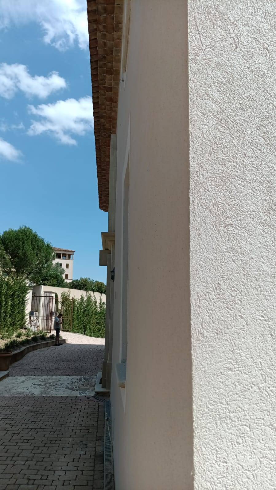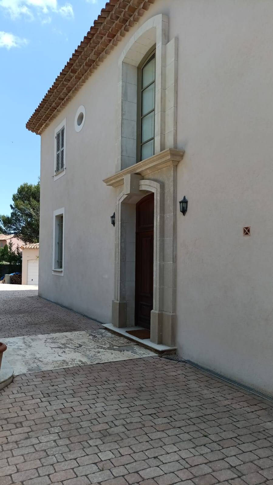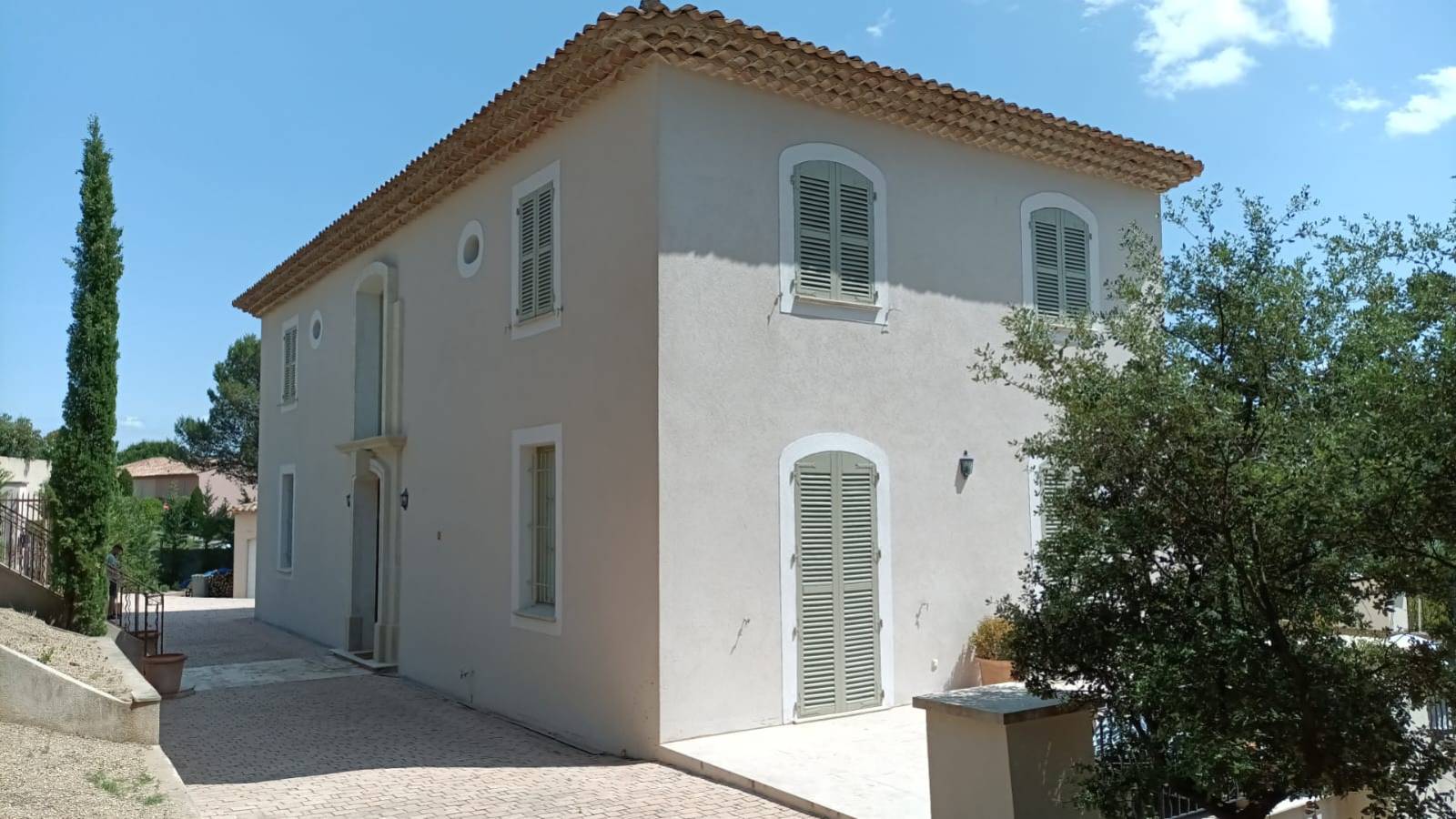 Résultat : un rendu élégant, durable et lumineux, parfaitement intégré au style architectural de la maison, avec un enduit clair rehaussé par des menuiseries vert amande.