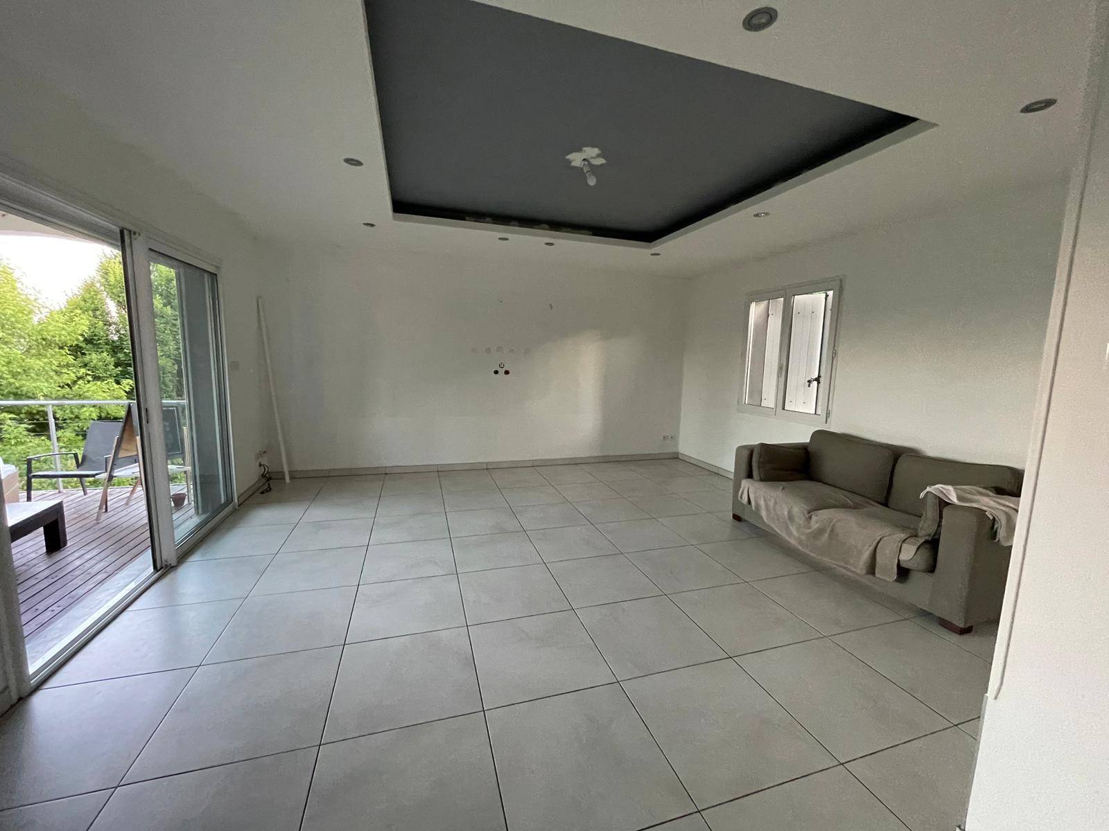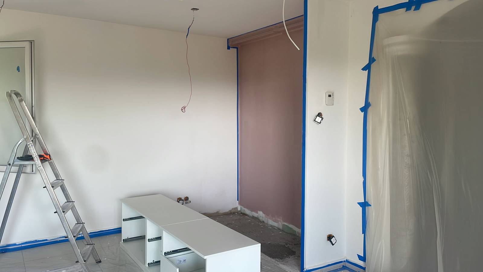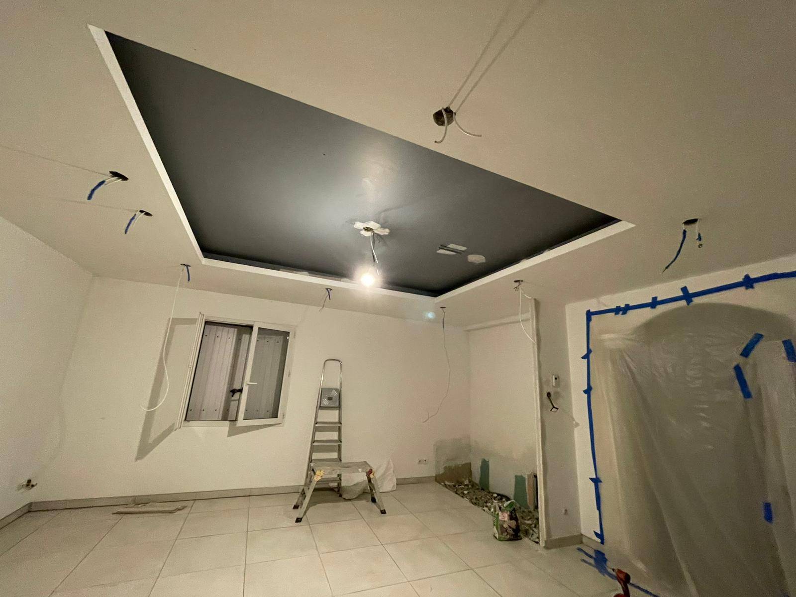 Une fois les murs préparés, la mise en peinture a permis de redonner vie à la pièce. Des tons clairs ont été privilégiés pour agrandir visuellement l’espace et maximiser la luminosité naturelle. L’association de murs blancs et de touches colorées (rosé poudré et gris contemporain) apporte une atmosphère à la fois chaleureuse et moderne. Le plafond a également été retravaillé avec un effet de contraste sombre dans la partie centrale, créant une mise en valeur élégante de la pièce à vivre.